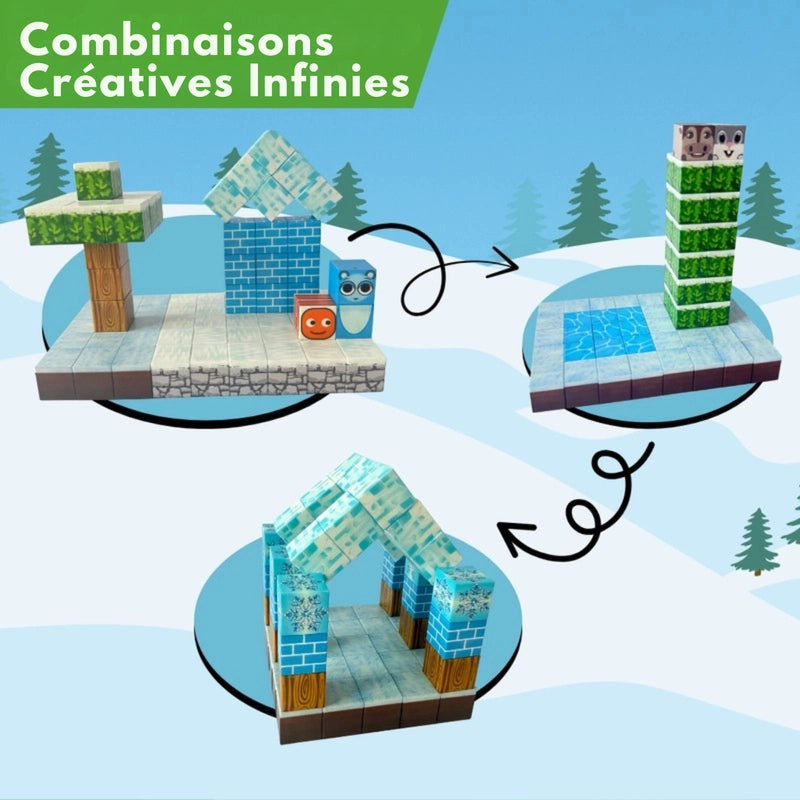 Chaque pièce est une invitation à l'imagination! Votre enfant pourra construire des châteaux de glace, des créatures scintillantes et des paysages enneigés, développant ainsi son potentiel créatif sans limites et loin des écrans.